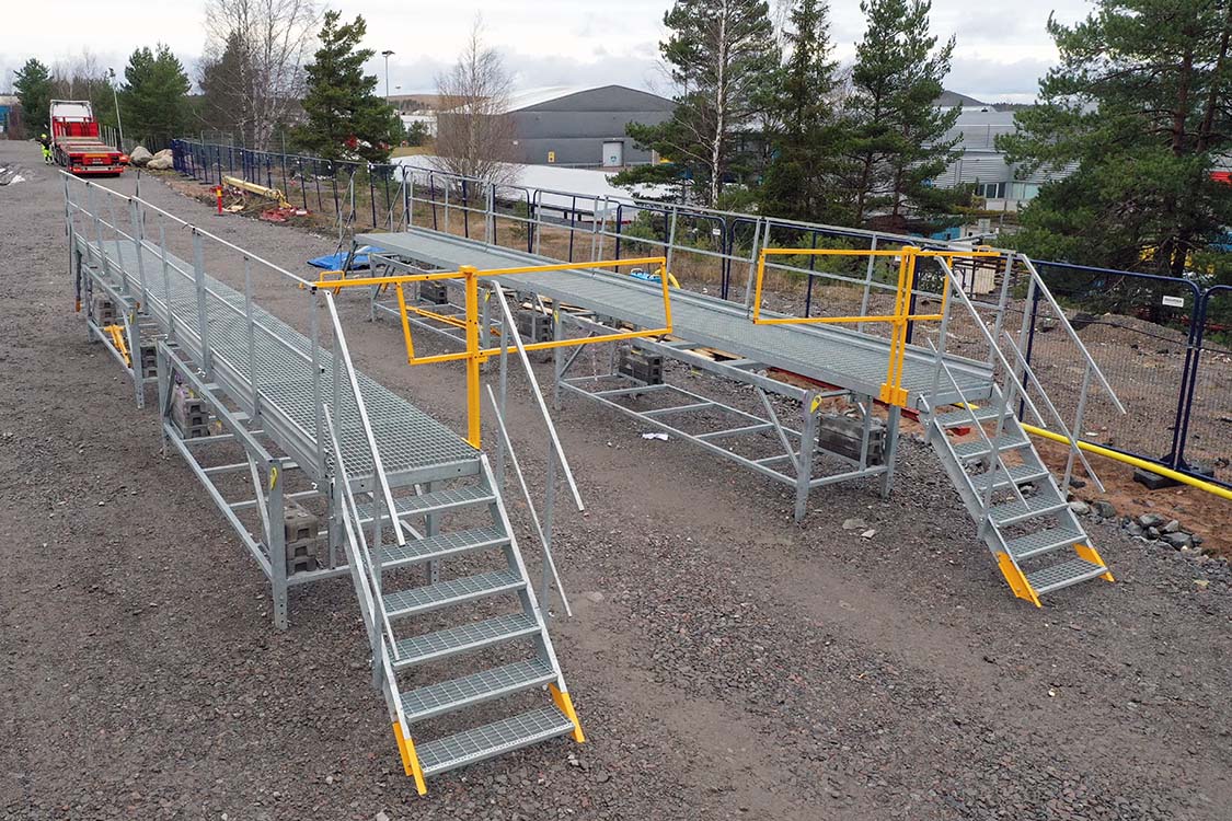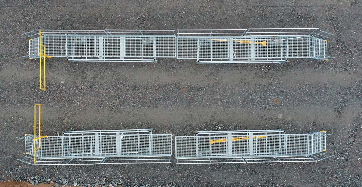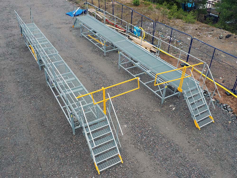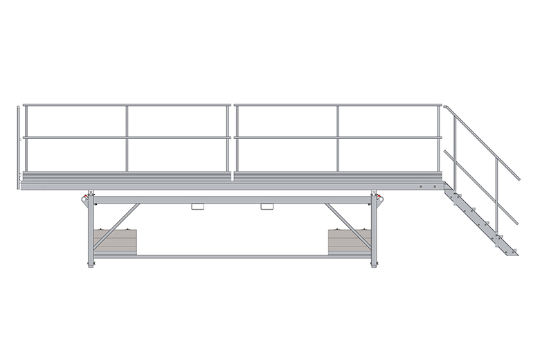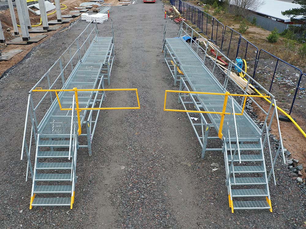 Telineen molempiin päihin voidaan kiinnittää portaat. Turvakaiteet pitkille sivuille ovat vakiona.