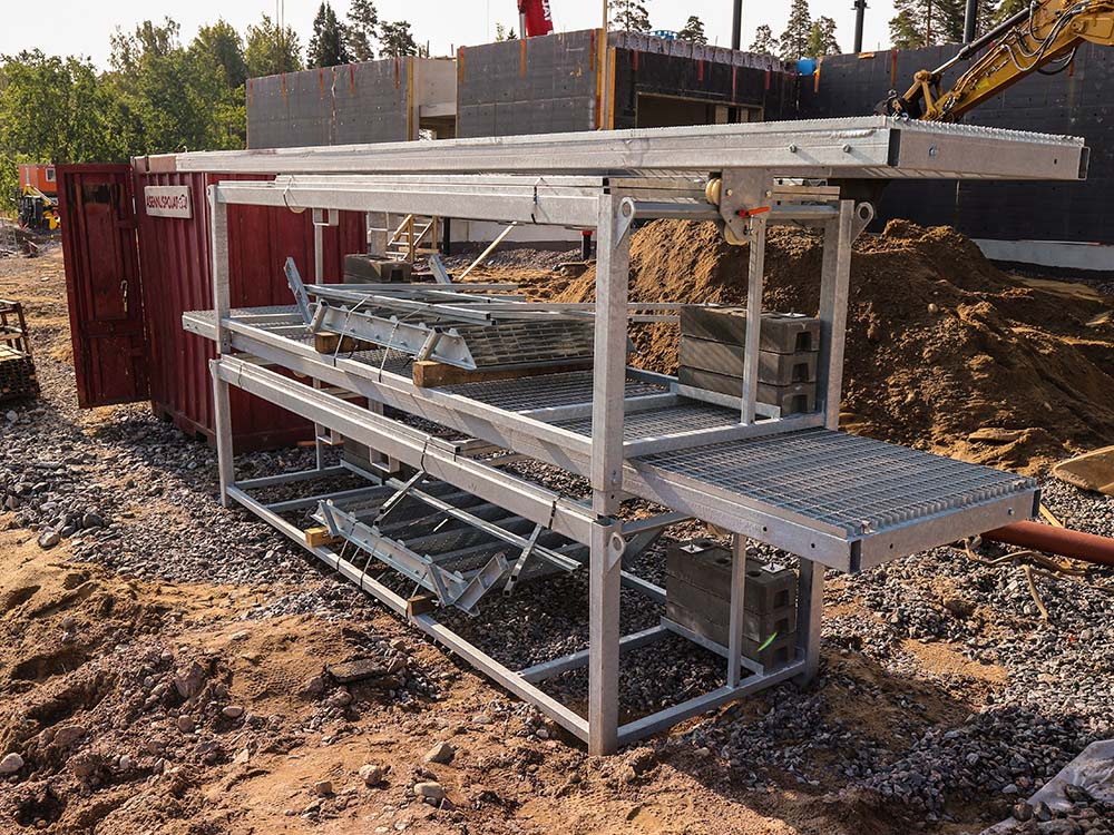 Kulkutaso ja portaat on valmistettu turvatasoritilästä, mikä takaa turvallisen kävelyn telineellä myös talvella.